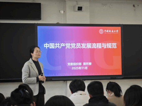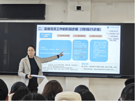 培训采用“理论讲解+实务指导”相结合的方式。蒋怀柳老师以“中国共产党党员发展流程与规范”为题,结合《中国共产党发展党员工作细则》与学校党员发展工作管理要求,系统阐述了发展党员工作的重要意义。她指出,发展党员是党的建设中的基础性、经常性工作,关系到党组织的生机与活力。质量是发展党员的生命线,必须全面贯彻“控制总量、优化结构、提高质量、发挥作用”的十六字方针,结合学科专业特点,严格程序、分层把关,确保每一位新发展党员政治合格、素质过硬。蒋老师围绕党员发展工作的组织流程,详细讲解了从申请入党、入党积极分子的确定和培养、发展对象的确定和考察,到预备党员的接收、教育考察及转正等关键环节的注意事项,系统梳理了“五阶段二十五步骤”的规范流程,并结合实际案例,深入解析了各阶段材料的撰写规范与常见问题。
